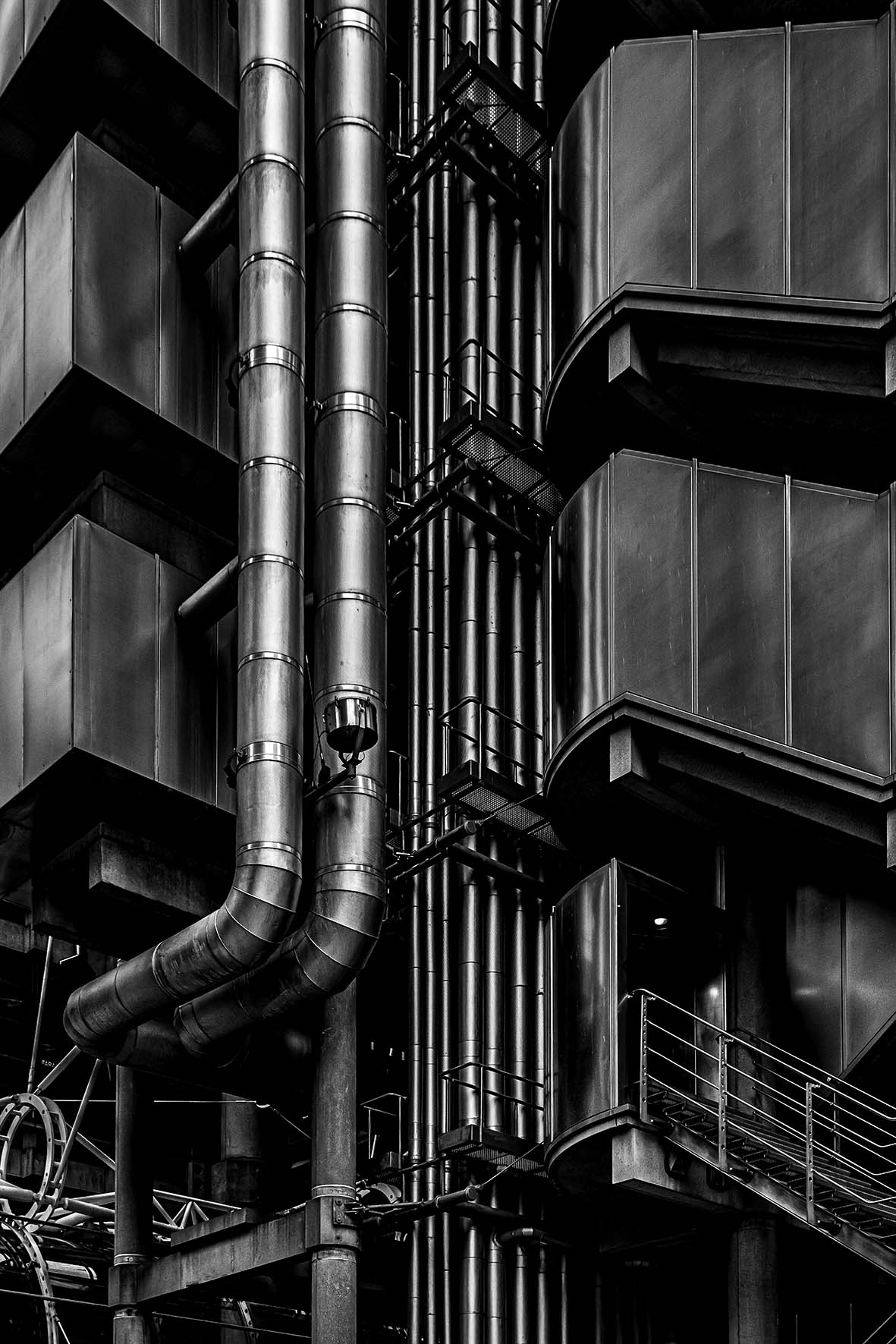 Vertikale und diagonale Formen fügen sich zu einer grafischen Komposition. Spiegelungen schaffen Tiefe und Rhythmus.